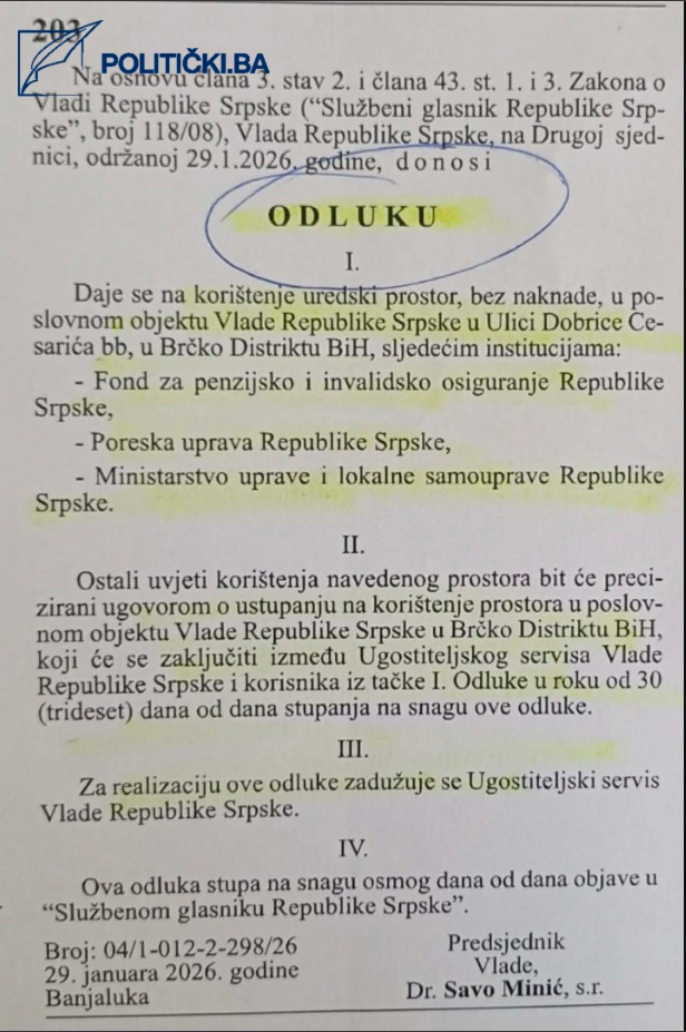 Odluka Vlade Republike Srpske o otvaranju entitetskih kancelarija na području Brčko distrikta objavljena je 29. januara ove godine u Službenom glasniku Republike Srpske. Prema navedenom aktu, odluka stupa na snagu osam dana od dana objave.