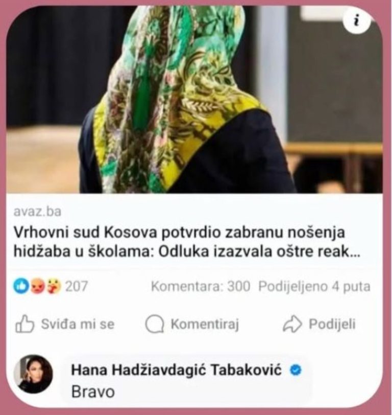 Među onima koji su podržali ovu odluku našla se i bosanskohercegovačka influenserka Hana Hadžiavdagić-Tabaković, poznata po svojim otvorenim i često kontroverznim stavovima. Ona je na društvenim mrežama reagovala ispod objave portala Avaz.ba, kratko napisavši: