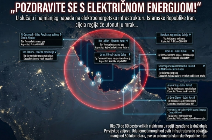 Na objavljenoj karti označene su velike elektrane i energetska postrojenja u zemljama Perzijskog zaljeva, uz podatke o njihovoj vrsti i kapacitetima. Poruka koja prati grafiku je direktna: