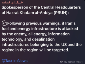 “Ako neprijatelj napadne iransku naftnu i energetsku infrastrukturu, meta će biti sva energetska, informacijska i infrastruktura za desalinizaciju koja pripada Sjedinjenim Državama i režimu u regiji”, rekao je glasnogovornik Khatam al-Anbiya.
