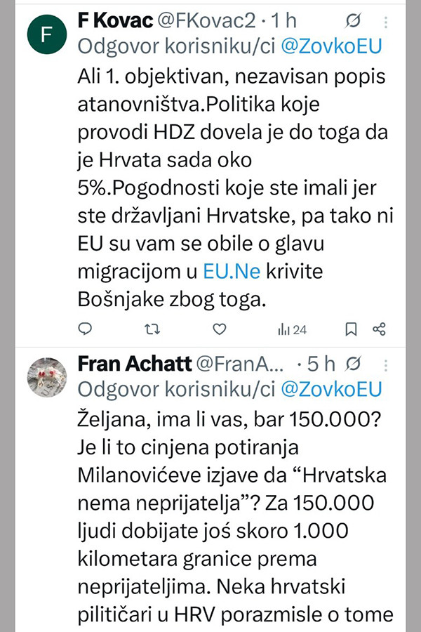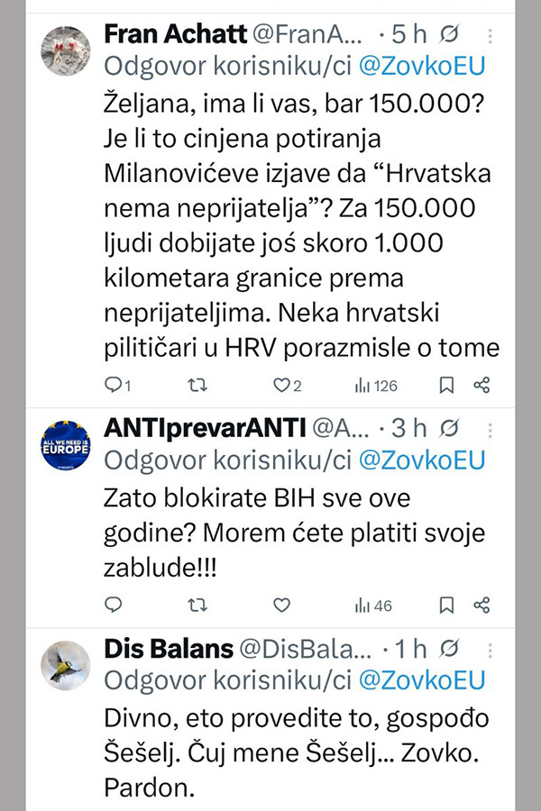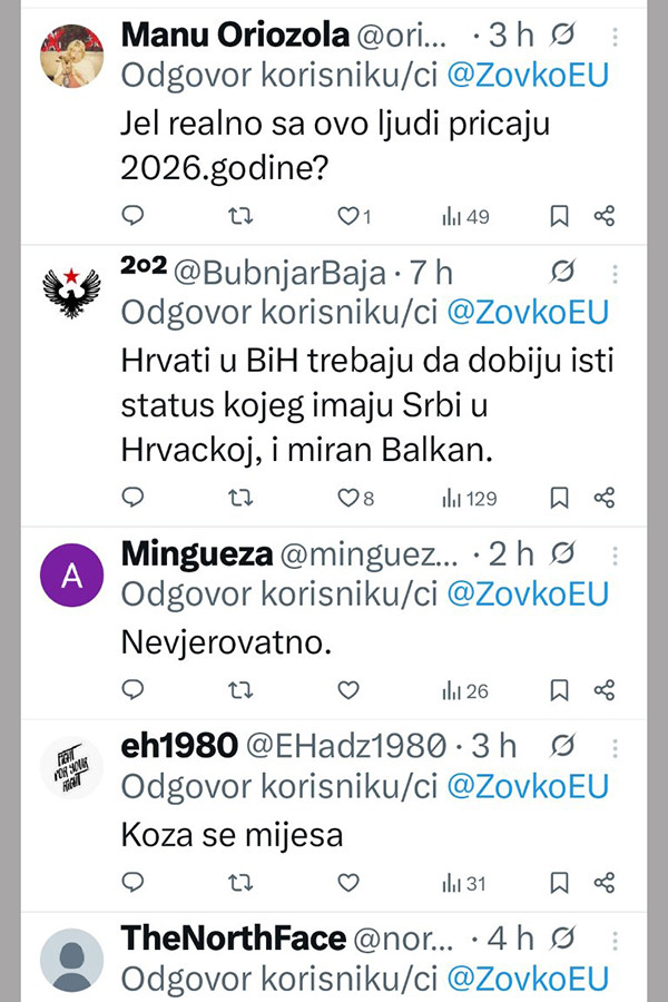 Reakcije na izjave Željane Zovko ne prestaju ni danima nakon njenog istupa u Briselu, gdje je iznijela stav da Bosna i Hercegovina već u praksi funkcioniše kroz tri federalne jedinice, te da bi takvo stanje, prema njenom mišljenju, trebalo dobiti i ustavni okvir.