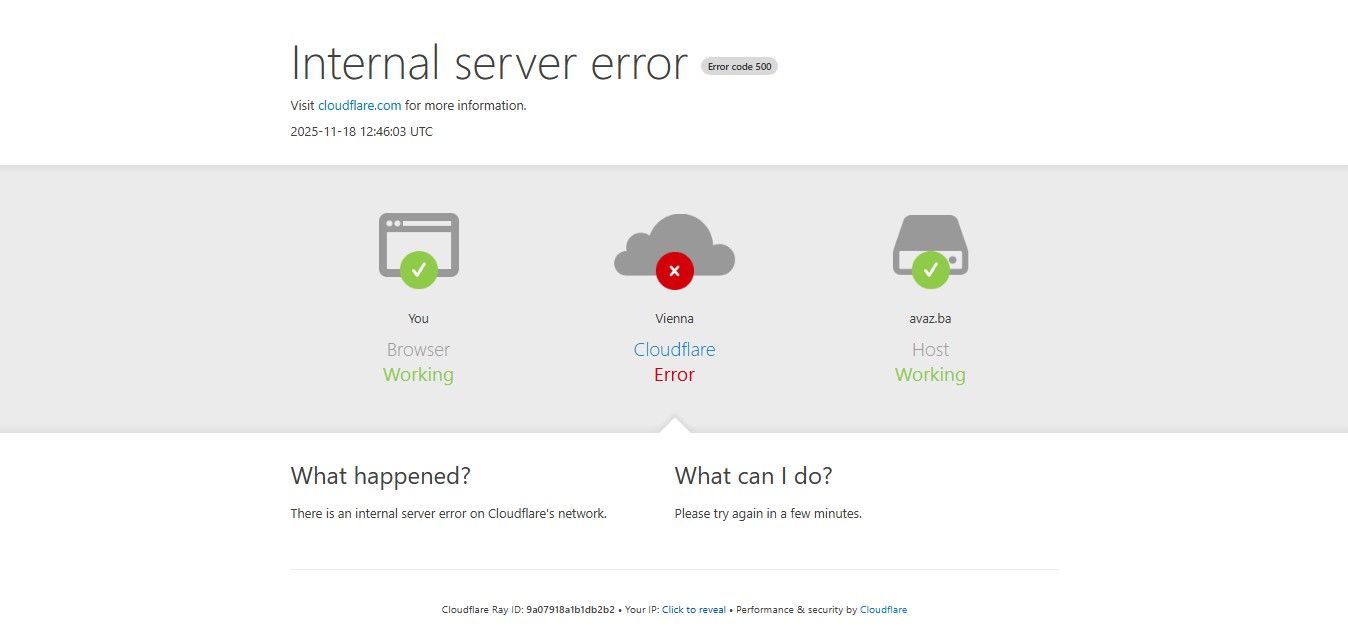 Cloudflare, jedan od najvećih svjetskih servisa za zaštitu i ubrzavanje web stranica, danas se suočava s ozbiljnim tehničkim problemima koji utiču na dostupnost velikog broja portala širom svijeta – uključujući i najposjećenije medije u BiH kao što su Avaz.ba, Klix.ba, Vijesti.ba i drugi.