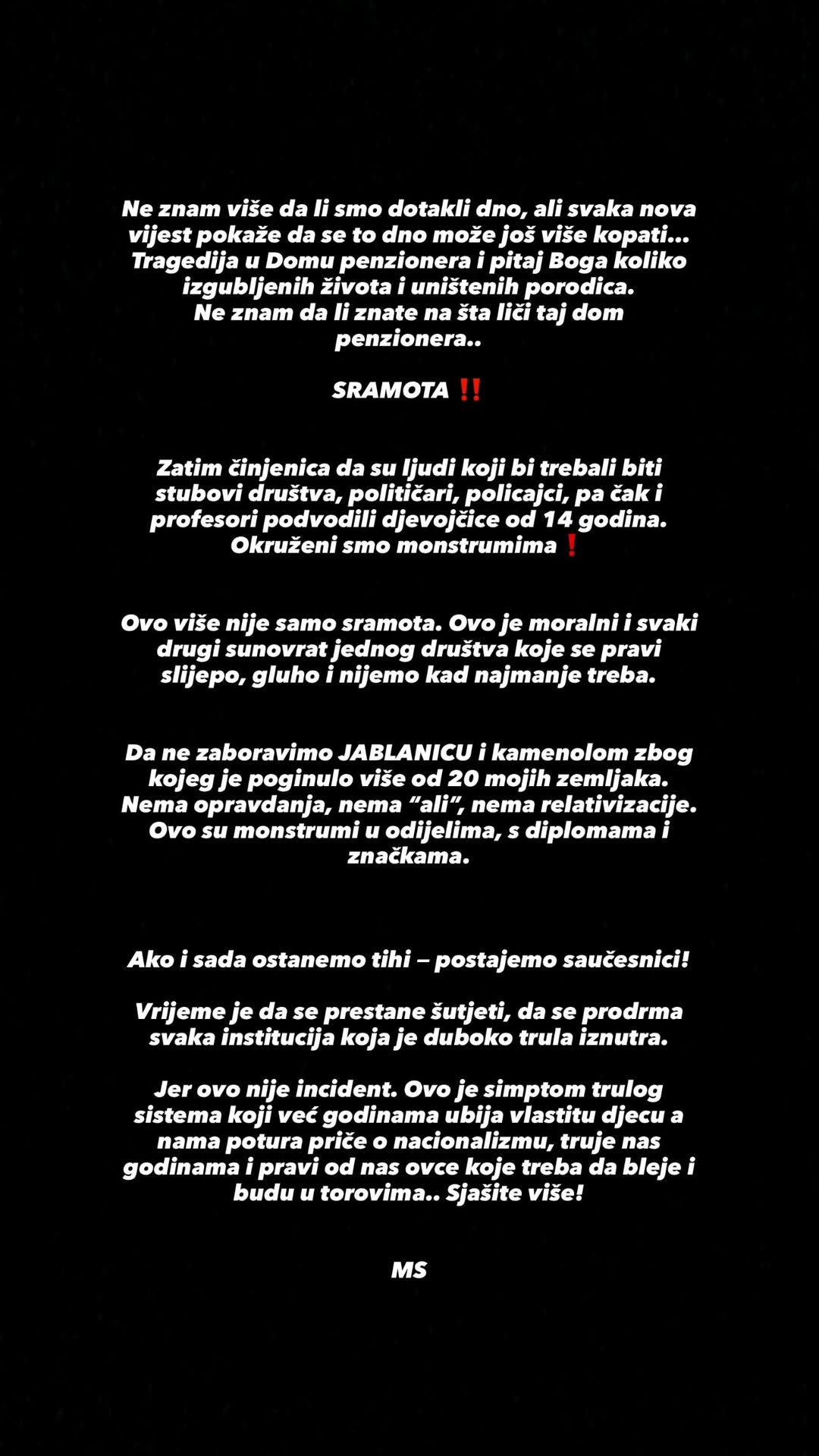 Nakon strašnog požara u Domu penzionera u Tuzli, u kojem je život izgubilo deset osoba, a više od dvadeset je povrijeđeno, reagovao je i poznati pjevač Mirza Selimović. Njegova emotivna i oštra poruka, objavljena na društvenim mrežama, odjeknula je među hiljadama građana.