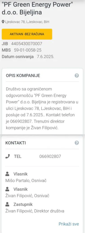 Kompanija „PF Green Energy Power“ registrovana je u maju prošle godine, a njen trenutni direktor je Živan Filipović. Među osnivačima i vlasnicima, prema dostupnim podacima, navodi se i Mišo Partalo.