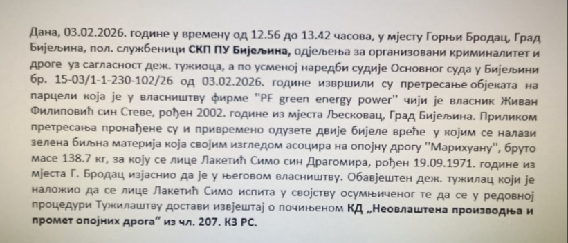 Tokom policijskih aktivnosti oduzeto je ukupno 138 kilograma opojne droge, a Simo Laketić iz sela Gornji Brodac priznao je da se pronađena marihuana nalazi u njegovom vlasništvu. Dežurni tužilac naložio je da Laketić bude ispitan u svojstvu osumnjičenog.