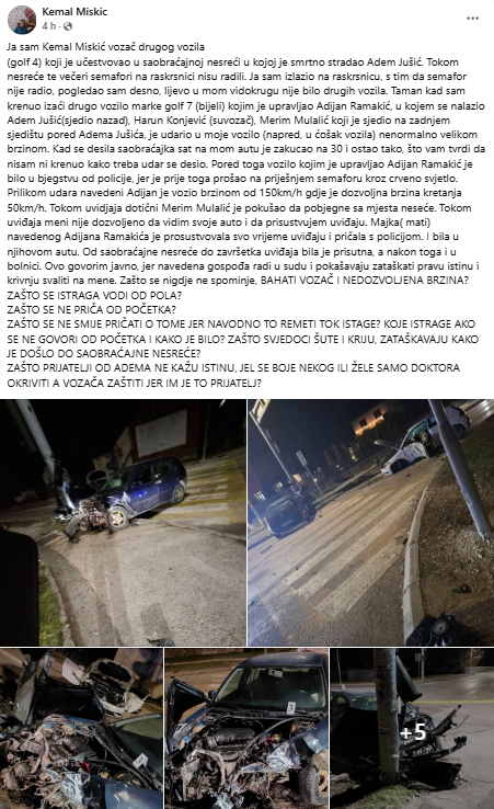 Ja sam Kemal Miskić, vozač drugog vozila – Golfa 4 – koje je učestvovalo u saobraćajnoj nesreći u kojoj je, nažalost, život izgubio Adem Jušić. Smatram da je moja obaveza da se obratim javnosti i iznesem svoju stranu događaja, jer se u javnom prostoru iznose nepotpune informacije, dok se ključne činjenice prešućuju ili zanemaruju.