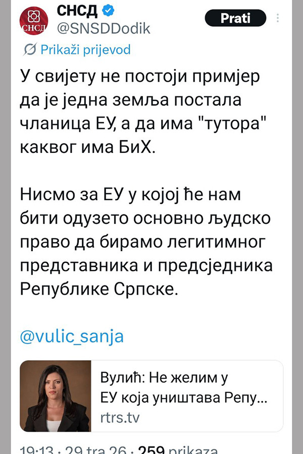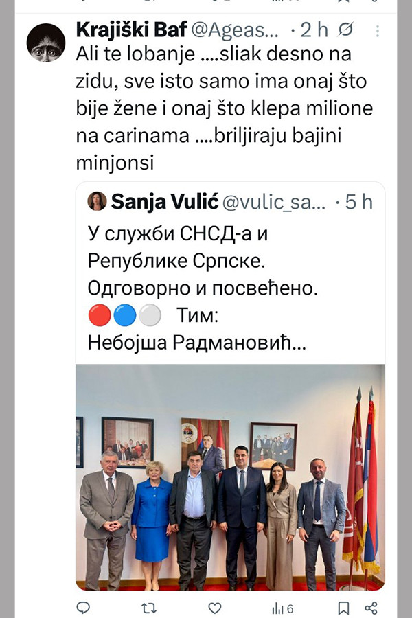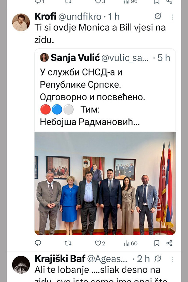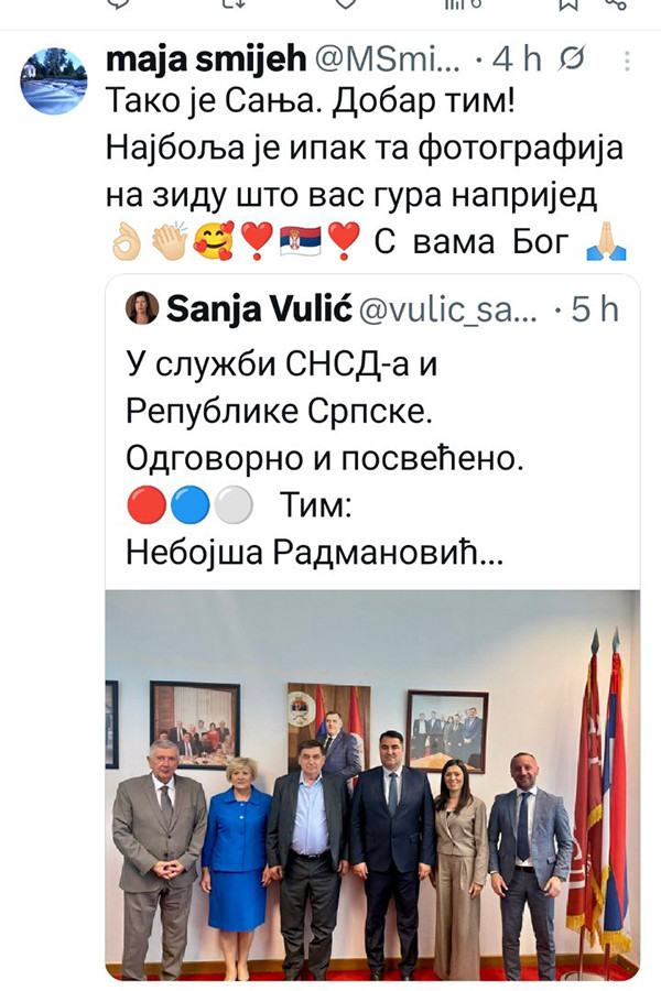 Naime, Vulić je podijelila fotografiju na kojoj pozira sa stranačkim kolegama ispod slike predsjednika Republike Srpske, Milorad Dodik. Upravo taj detalj ponovo je privukao pažnju javnosti, imajući u vidu njene ranije izjave u kojima je Dodika opisivala kao izuzetno važnu ličnost, što je i ranije izazivalo brojne polemike.
