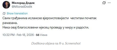 – Svim građanima islamske vjeroispovijesti čestitam početak ramazana. Neka ovaj blagosloveni mjesec provedu u miru i radosti – poručio je Dodik.