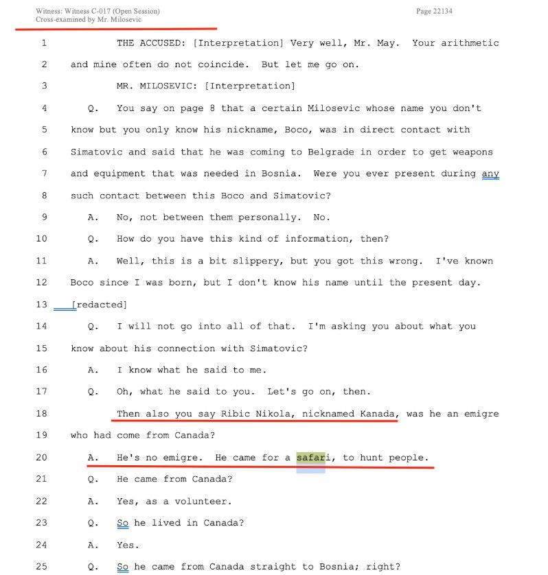Njegova uloga potvrđena je tokom suđenja Slobodanu Miloševiću pred Haškim tribunalom, gdje je zaštićeni svjedok C-017 izjavio da je Ribić “došao iz Kanade na safari da lovi ljude”. Svjedok je naveo da je Ribić bio pripadnik jedinice “Bijeli vukovi”, grupe koja je djelovala na sarajevskim ratištima.