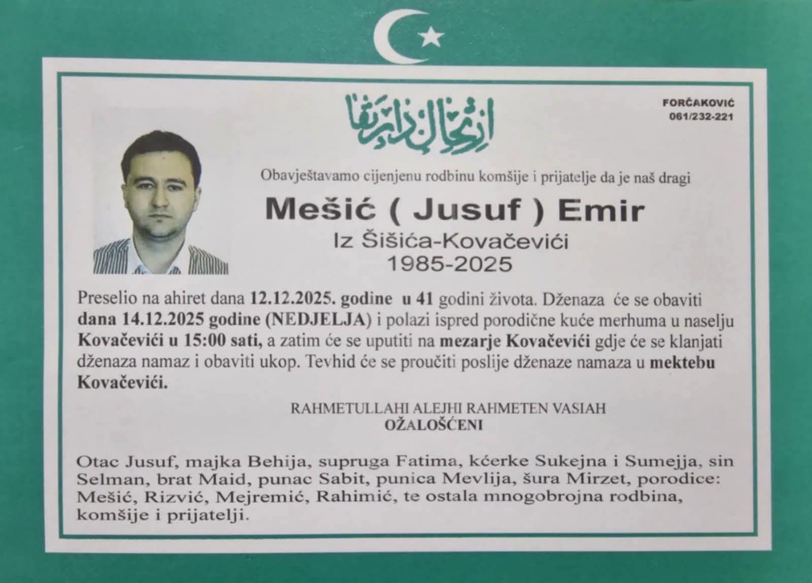 Emir Mešić, jedan od najpoznatijih prijavitelja korupcije u Bosni i Hercegovini, biće sahranjen sutra na mjesnom mezarju Kovačevići u Živinicama. Preminuo je u 41. godini života, a njegova smrt duboko je potresla javnost i ponovo otvorila pitanje stvarne zaštite zviždača u BiH.