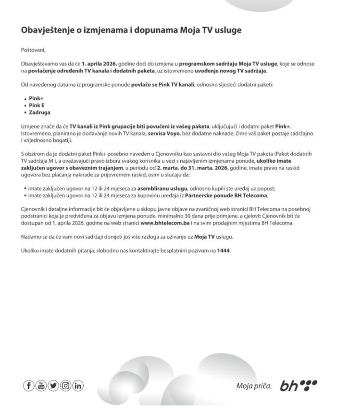 Kompanija BH Telecom obavijestila je korisnike usluge MojaTV da će od 1. aprila 2026. godine iz svoje televizijske ponude ukloniti kanale iz Pink grupacije. Ova odluka podrazumijeva potpuni prestanak distribucije svih Pink sadržaja unutar sistema MojaTV i Moja webTV.