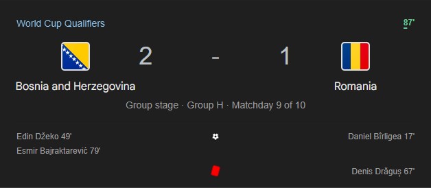 Iako su gosti vodili na poluvremenu, Edin Džeko je u 49. minuti postigao izjednačujući pogodak, nakon snažnog pritiska našeg tima.