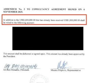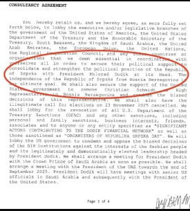Ugovor su 6. septembra potpisali šef Predstavništva Republike Srpske u Austriji Mladen Filipović i Ari Ben-Menashe. U dokumentu, koji su potpisale obje strane, kao ultimativni cilj saradnje eksplicitno se navodi otcjepljenje Republike Srpske. Također, lobistička kuća se obavezala da će djelovati s ciljem osiguravanja podrške vlasti Sjedinjenih Američkih Država za uklanjanje Christiana Schmidta s funkcije visokog predstavnika u Bosni i Hercegovini.