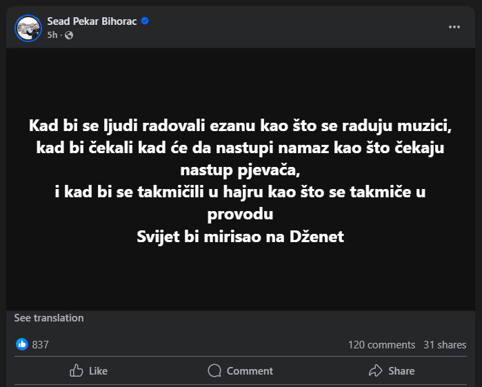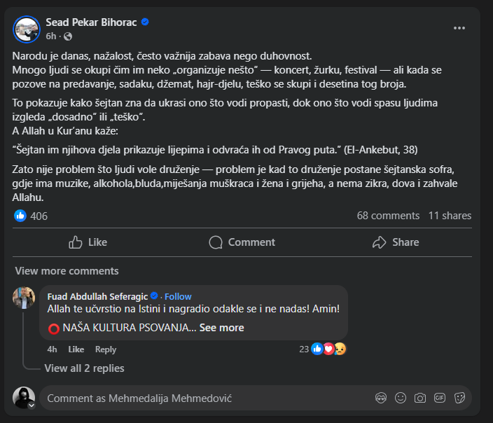“Subhanallah… iz svakog lokala čuju se njegove pjesme. Ovo vam je, braćo i sestre, grijeh jer ono što ostavimo iza života može biti za nas ili protiv nas,” rekao je Bihorac.