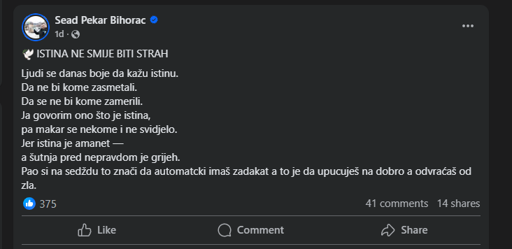 Poznati pekar i humanista iz Novog Pazara, Sead Bihorac, izazvao je burne reakcije nakon što je na svom Facebook profilu objavio dvije snažne poruke i video snimak snimljen na sarajevskoj Baščaršiji. Njegove objave, koje su se brzo proširile društvenim mrežama, nose jasnu vjersku poruku o odgovornosti za ono što čovjek ostavlja iza sebe.
