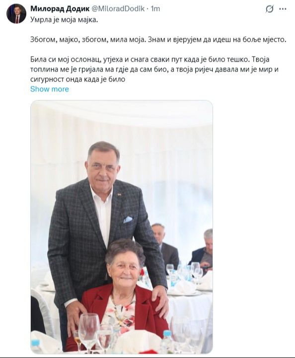 Lider SNSD-a i bivši predsjednik Republike Srpske Milorad Dodik obavijestio je javnost da je preminula njegova majka, što je podijelio putem društvenih mreža.