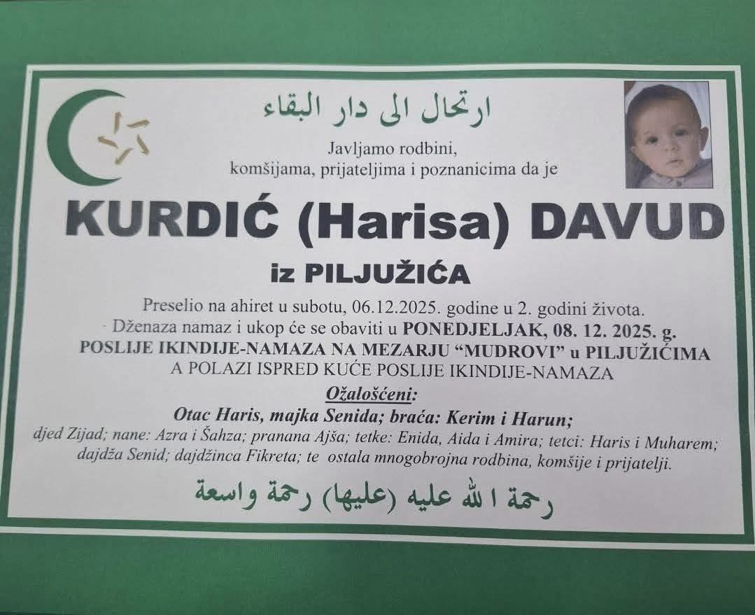 Velika tuga zavila je Piljužiće i širu zajednicu nakon vijesti da je na ahiret preselio dvogodišnji Davud Kurdić, sin Harisa Kurdića, piše 072info. Njegov prerani odlazak ostavio je duboku bol porodici, rodbini, komšijama i svim prijateljima koji su ga poznavali.