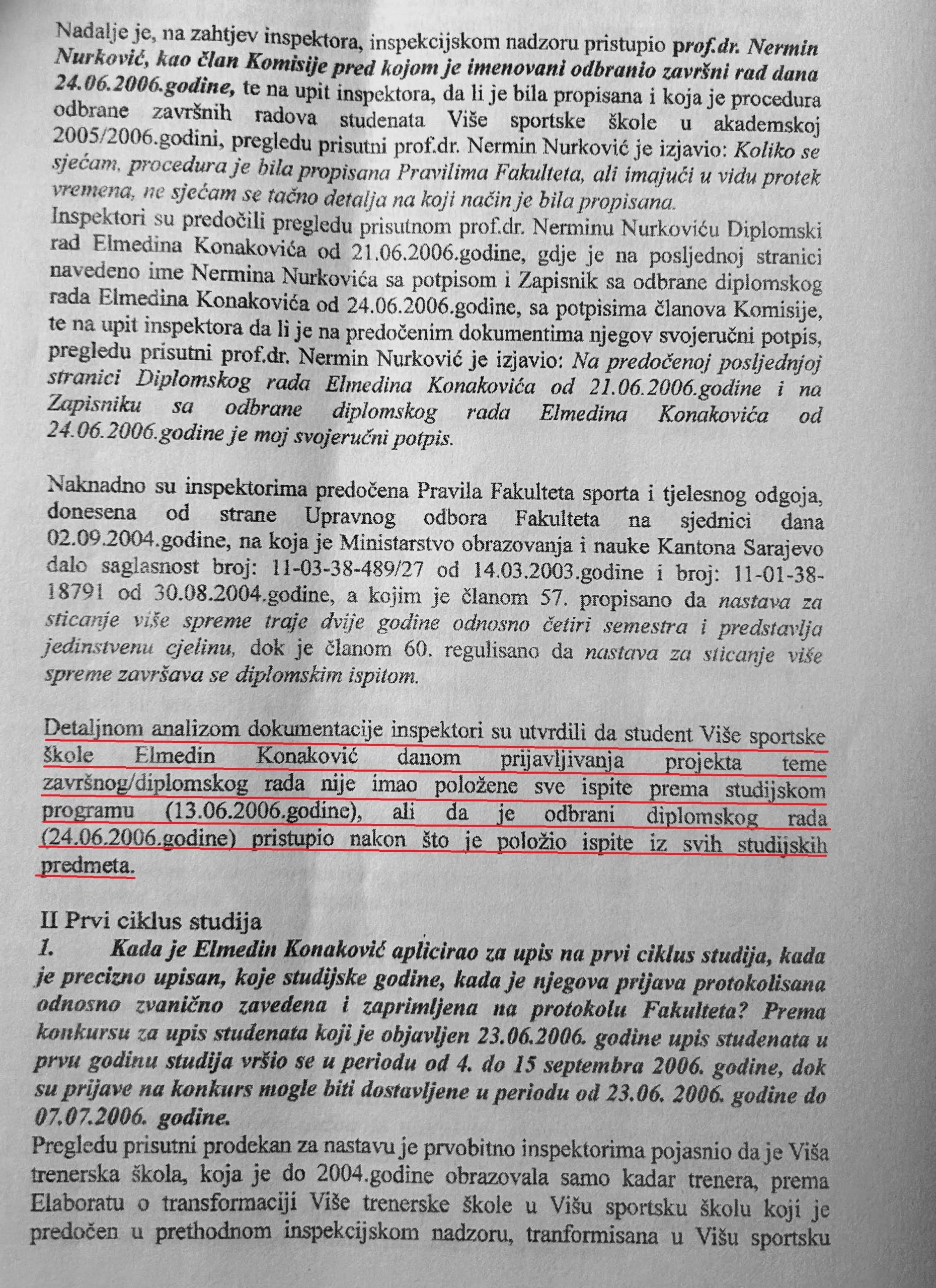 Neposrednim uvidom u Knjigu diplomiranih studenata inspektori su utvrdili da je Konaković odbranio rad istog dana i pred istom komisijom kao još 16 studenata sa smjera viši sportski menadžment.